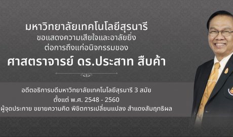 ขอแสดงความเสียใจและอาลัยยิ่งต่อการถึงแก่อนิจกรรมของศาสตราจารย์เกียรติคุณ ดร.ประสาท สืบค้า อดีตอธิการบดีมหาวิทยาลัยเทคโนโลยีสุรนารี 3 สมัย ตั้งแต่ พ.ศ. 2548-2560 ศาสตราจารย์ ดร.ประสาท สืบค้า อดีตอธิการบดีมหาวิทยาลัยเทคโนโลยีสุรนารี (มทส.) 3 วาระ รวม 12 ปี ตั้งแต่ พ.ศ. 2548 – 2560 ตลอดระยะเวลา 12 ปีในตำแหน่งอธิการบดี ท่านเป็นผู้นำและมุ่งมั่นพัฒนา มทส. สู่ความเป็นเลิศในทุกภารกิจ ผลิตบัณฑิตนักวิทยาศาสตร์และเทคโนโลยี ผู้มีภูมิรู้ ภูมิธรรม ภูมิปัญญา ภูมิฐาน และภูมิใจ รวมทั้งธำรงไว้ซึ่งความเป็นมหาวิทยาลัยแห่งการสร้างสรรค์นวัตกรรม เป็นผู้ขับเคลื่อนมหาวิทยาลัยให้ก้าวสู่ความเป็นเลิศทั้งด้านวิชาการ การวิจัย และการบริการวิชาการ เพื่อประโยชน์สูงสุดต่อประเทศชาติและประชาชน โดยยึดหลัก “ปัญหาของสังคมคือโจทย์วิจัยของมหาวิทยาลัย” ด้วยนโยบาย “จากหิ้งลงสู่ห้าง” นำผลงานวิจัยไปต่อยอดในเชิงพาณิชย์ เชิงอุตสาหกรรม หรือสร้างประโยชน์สู่สังคมในวงกว้าง และตอบโจทย์ความต้องการของชุมชนได้จริง พร้อมยืนหยัดเป็น “สถาบันคู่เคียงและเป็นที่พึ่งของสังคม” ด้วยวิสัยทัศน์ที่ก้าวไกลและความมุ่งมั่นที่แน่วแน่ ภายใต้การนำของท่าน มทส. เติบโตอย่างรวดเร็วและมั่นคง ทำให้มหาวิทยาลัยมีความเจริญรุดหน้าในระยะเวลาเพียงไม่กี่ปี และผลักดันจน มทส. ก้าวขึ้นเป็น “1 ใน 9 มหาวิทยาลัยวิจัยแห่งชาติ” เป็นมหาวิทยาลัยดีเลิศด้านการวิจัย และดีเยี่ยมด้านการเรียนการสอน และได้รับความเชื่อมั่นในฐานะ “มหาวิทยาลัยแห่งนวัตกรรม” ที่เป็นที่พึ่งของสังคม นับเป็นผู้ “ผู้จุดประกาย ขยายความคิด พิชิตการเปลี่ยนแปลง สำแดงสัมฤทธิผล” ให้กับ มทส. อย่างแท้จริง ตลอดชีวิตการทำงาน ท่านดำรงตำแหน่งสำคัญระดับชาติและนานาชาติจำนวนมาก นอกเหนือจากดำรงตำแหน่งอธิการบดีมหาวิทยาลัยเทคโนโลยีสุรนารี 3 วาระแล้ว ท่านยังดำรงตำแหน่งบริหารสำคัญหลายตำแหน่ง อาทิ รองอธิการบดี รวม 4 ฝ่าย ของมหาวิทยาลัยเทคโนโลยีสุรนารี (วิชาการ วางแผน บริหาร พัฒนา) คณบดีสำนักวิชาวิทยาศาสตร์ มหาวิทยาลัยเทคโนโลยีสุรนารี คณบดีสำนักวิชาแพทยศาสตร์ (รักษาการ) มหาวิทยาลัยเทคโนโลยีสุรนารี ประธานที่ประชุมสภาคณบดีวิทยาศาสตร์แห่งประเทศไทย (สควทท) ประธานคณะกรรมการบริหารโครงการพัฒนากำลังคนด้านวิทยาศาสตร์ (ทุนเรียนดีวิทยาศาสตร์) ประธานคณะกรรมการดำเนินการจัดตั้งสถาบันวิจัยดาราศาสตร์แห่งชาติ ที่ปรึกษารัฐมนตรีว่าการกระทรวงวิทยาศาสตร์ เทคโนโลยีและสิ่งแวดล้อม ประธานที่ประชุมอธิการบดีมหาวิทยาลัยในกำกับของรัฐ (ทอมก)Read more
